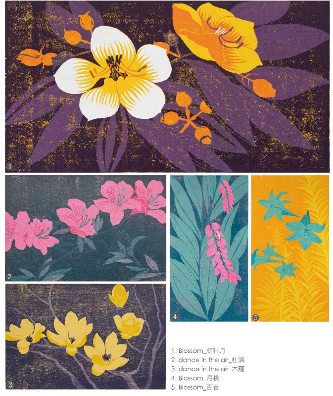 生命的故事是一串串的轉化而來,就像作品裡的月桃與百合甚至木蓮與杜鵑,它們固有的形體觀照雖然清晰不變,但卻以另類的色相跳躍在觀者的眼前,在大自然的畫系中,我們看見穿梭在山巒、雲靄、河流、日光裡的繽紛色彩,就是一個個鮮活交錯的自然精靈,這些飛舞奇妙色塊的斑斑點點,轉換的就是一場四季的舞作。
