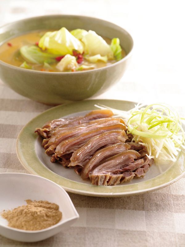 4.將羊腩取出切片,搭配薑絲、芹菜絲,沾紅麴豆腐乳調醬食用。
