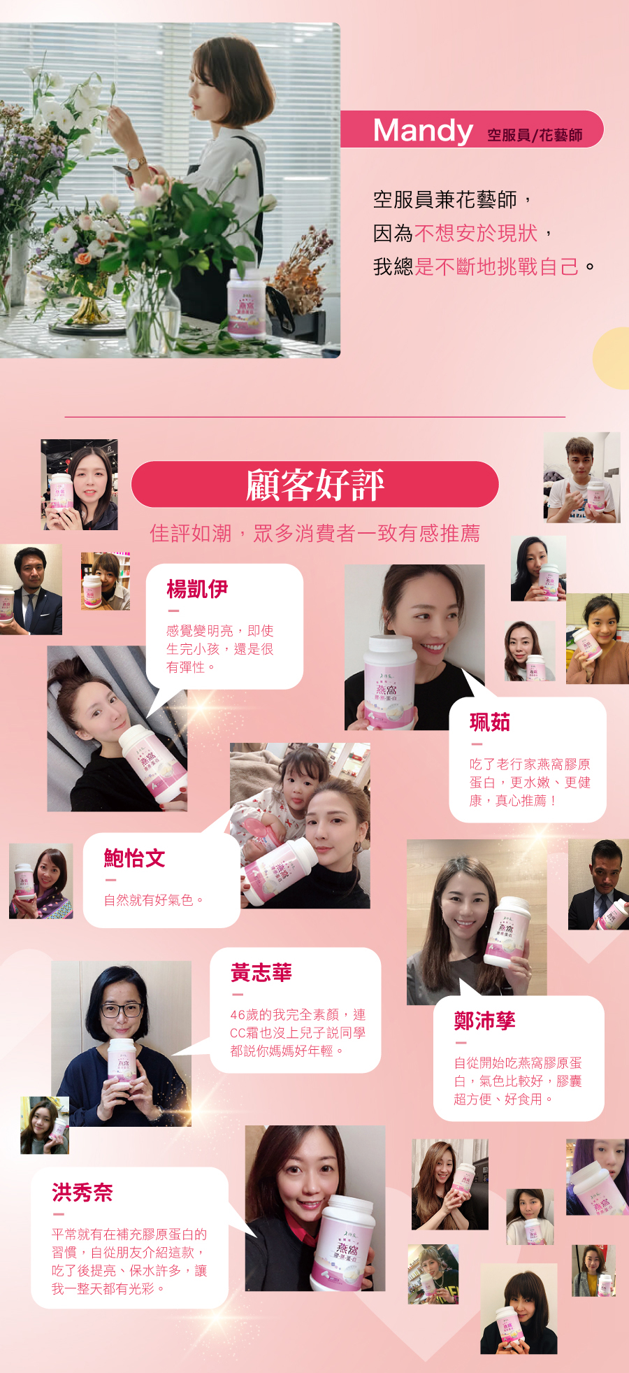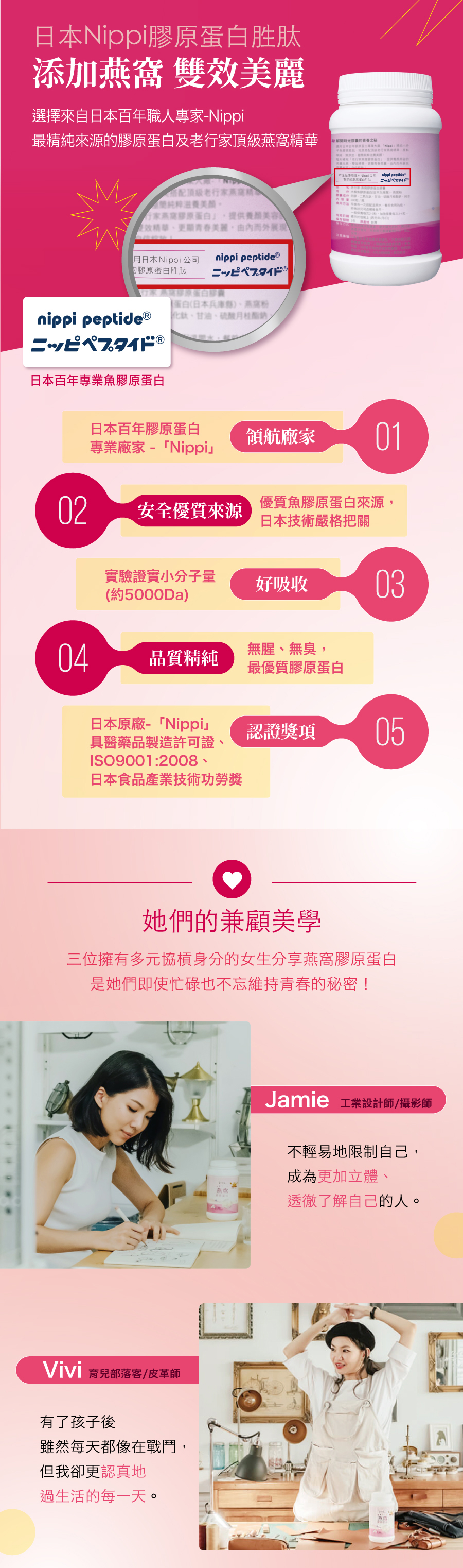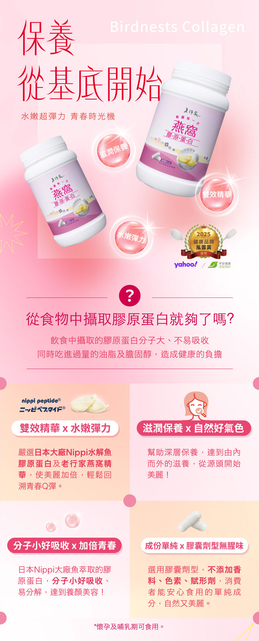 美麗來自真正的純粹!日本大廠「魚膠原蛋白」和頂級老行家燕窩精華,膠原蛋白與燕窩的完美搭配,原料單純不添加多餘成分,每天補充燕窩膠原蛋白,提供養顏美容的美麗元素,由內而外展現亮麗青春光采、讓每天的青春更多一點!
