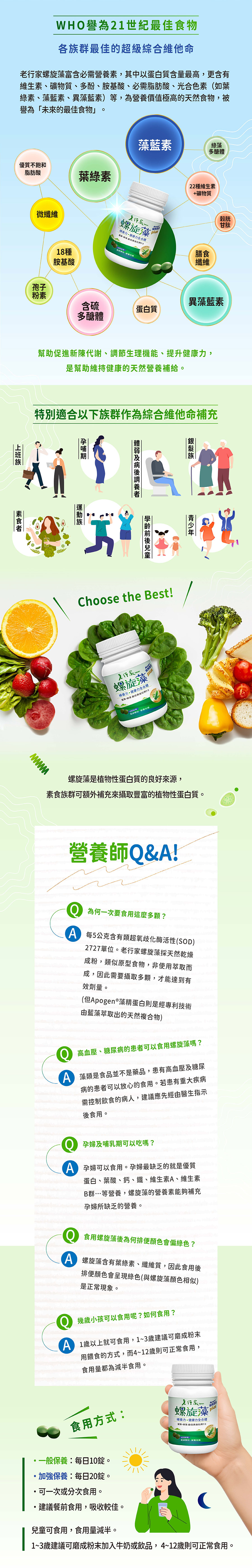 老行家螺旋藻以先進的生產技術,採藍藻+綠藻最佳黃金比例7:3,搭配研發多年具多國專利的Apogen ® 藻精蛋白,是每日最佳營養補給,還可幫助排便順暢、提升健康力,完美發揮螺旋藻與綠藻多元均衡的保健效果。