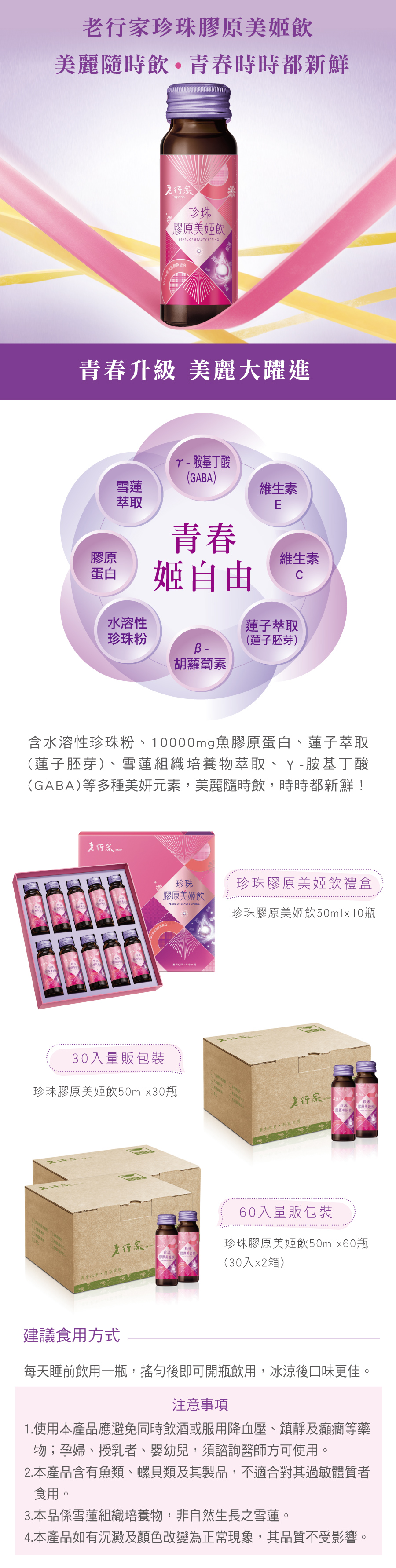 老行家珍珠膠原美姬飲給妳由內而外的美麗全能量,10,000毫克魚膠原蛋白,蓮子萃取(蓮子胚芽)、雪蓮組織培養物萃取、麩胺酸發酵物(發芽米萃取,含GABA)、水溶性珍珠粉等多種養顏美容元素,青春時時都新鮮。