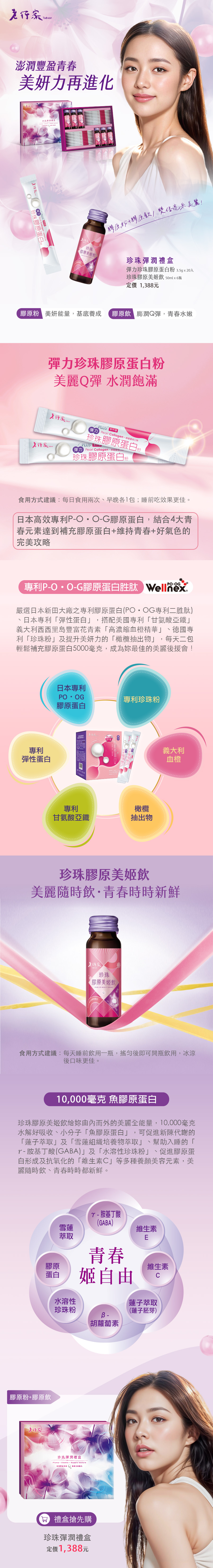內容物:彈力珍珠膠原蛋白粉3.5g/包*20入、珍珠膠原美姬飲50ml/瓶*6入