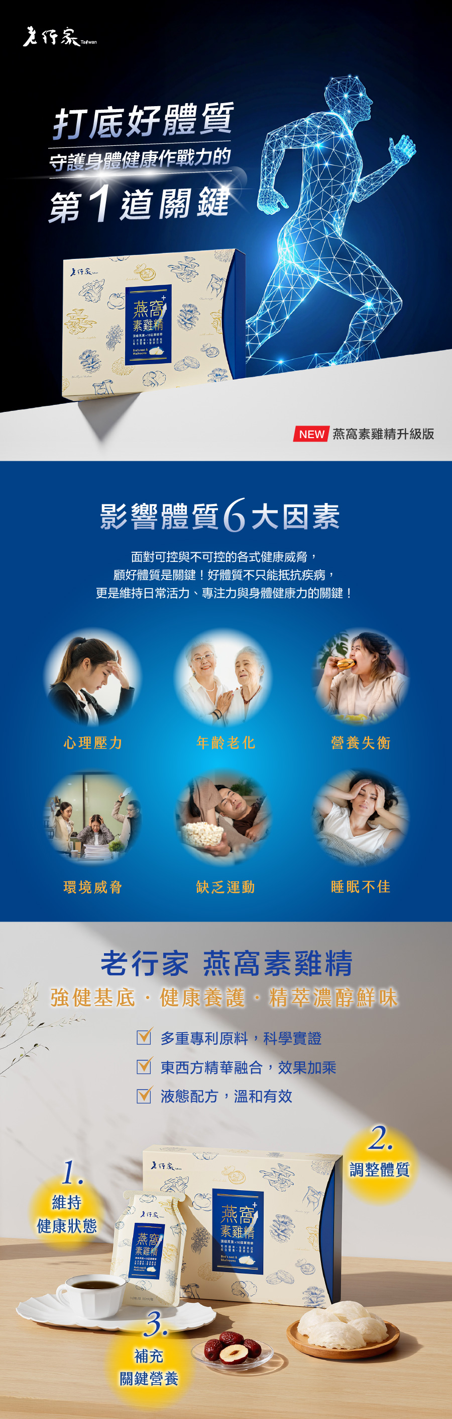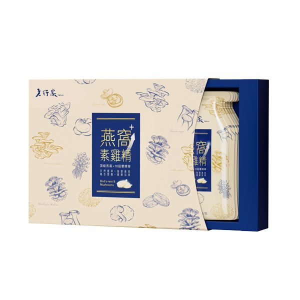 「老行家燕窩素雞精」以高溫高壓二次鮮萃10種菇蕈精華之「多醣體萃取液」,結合含珍貴EGF與天然燕窩酸(唾液酸)的專利「燕窩水解物」,再加上溫潤補養的「紅棗萃取液」作為調理滋養基底。