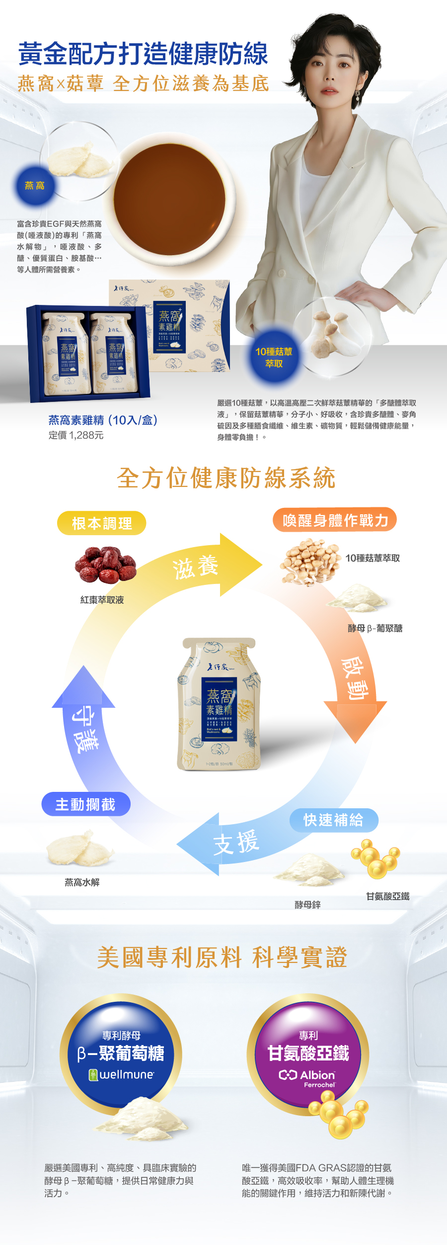 成份:多醣體萃取液(水、杏鮑菇、金針菇、秀珍菇、珊瑚菇、雪白菇、香菇、舞菇、黑木耳、白木耳、雪耳) 、紅棗萃取液(水、紅棗) 、β-聚葡萄糖、柑橘纖維、燕窩水解物(麥芽糊精、燕窩水解物) 、鋅酵母(啤酒酵母、硫酸鋅) 、甘氨酸亞鐵(甘氨酸亞鐵、檸檬酸、麥芽糊精、二氧化矽)。