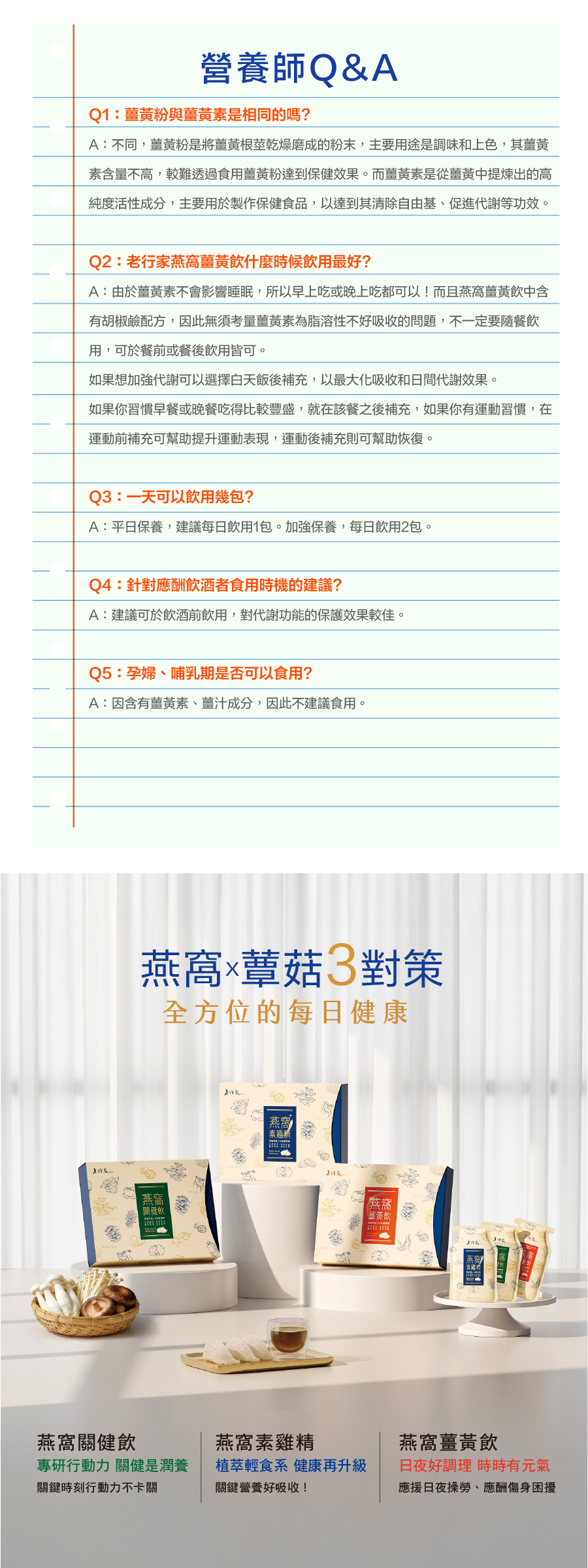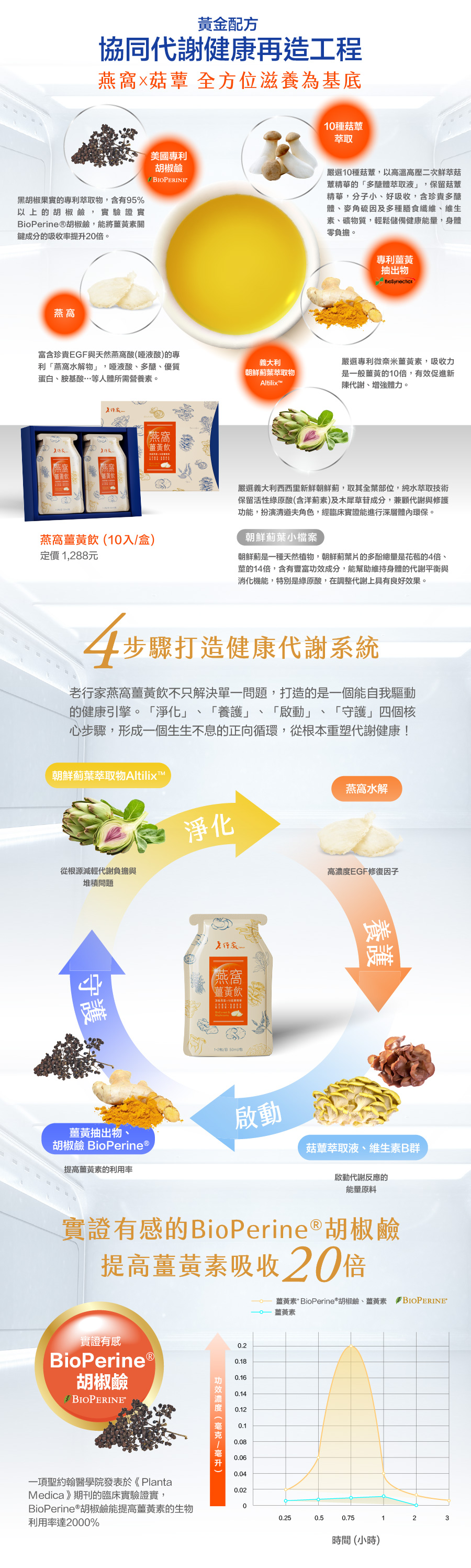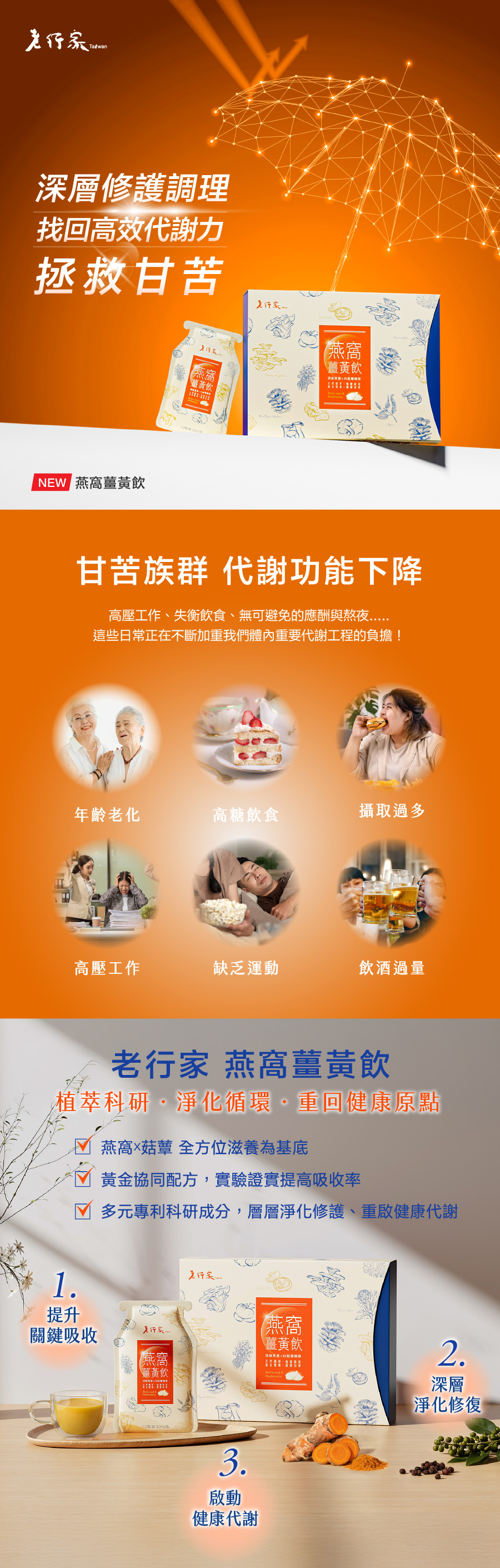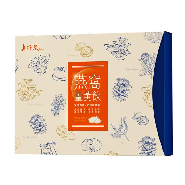 「老行家燕窩薑黃飲」以高溫高壓二次鮮萃10種菇蕈精華之「多醣體萃取液」,搭配含珍貴EGF與天然燕窩酸(唾液酸)的專利「燕窩水解物」為日常滋養基底。