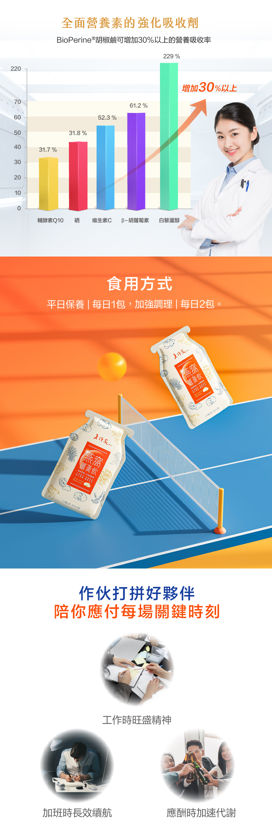 成份:水、多醣體萃取液(水、杏鮑菇、金針菇、秀珍菇、珊瑚菇、雪白菇、香菇、舞菇、黑木耳、白木耳、雪耳) 、蜂蜜、薑(水、薑) 、柑橘纖維、薑黃抽出物(薑黃抽出物、果膠(蘋果) 、D-木醣醇、脂肪酸蔗糖酯) 、朝鮮薊葉萃取物(朝鮮薊葉萃取物、麥芽糊精) 、燕窩水解物(麥芽糊精、燕窩水解物) 、綜合維他命B群(麥芽糊精、菸鹼醯胺、乾燥葡萄糖漿、本多酸鈣、鹽酸吡哆辛(維生素B6) 、硝酸硫胺明(維生素B1) 、核黃素(維生素B2) 、葉酸、生物素、檸檬酸鈉、檬酸酸、氰鈷胺明(維生素B12)、胡椒鹼抽出物(黑胡椒抽出物)。