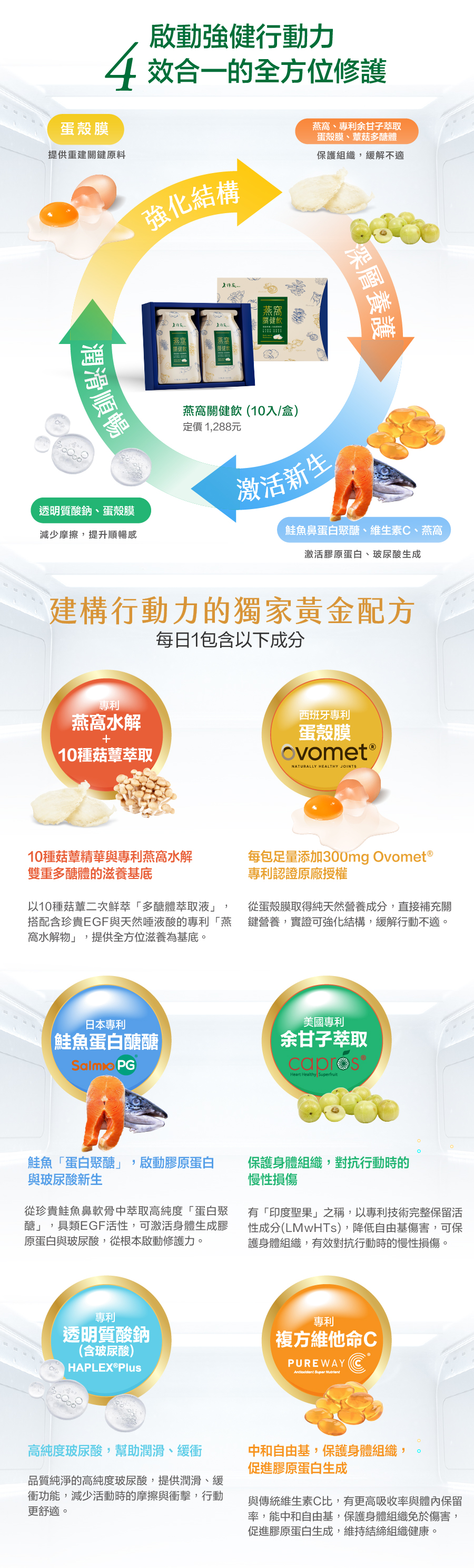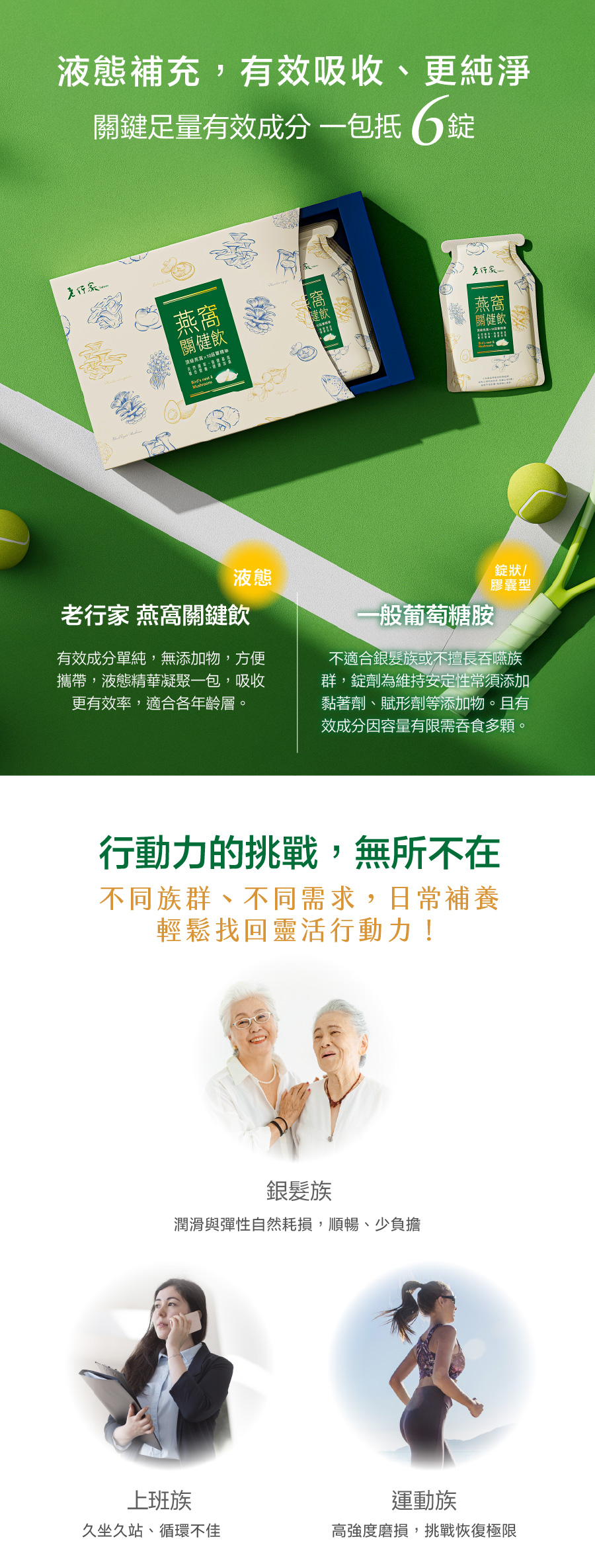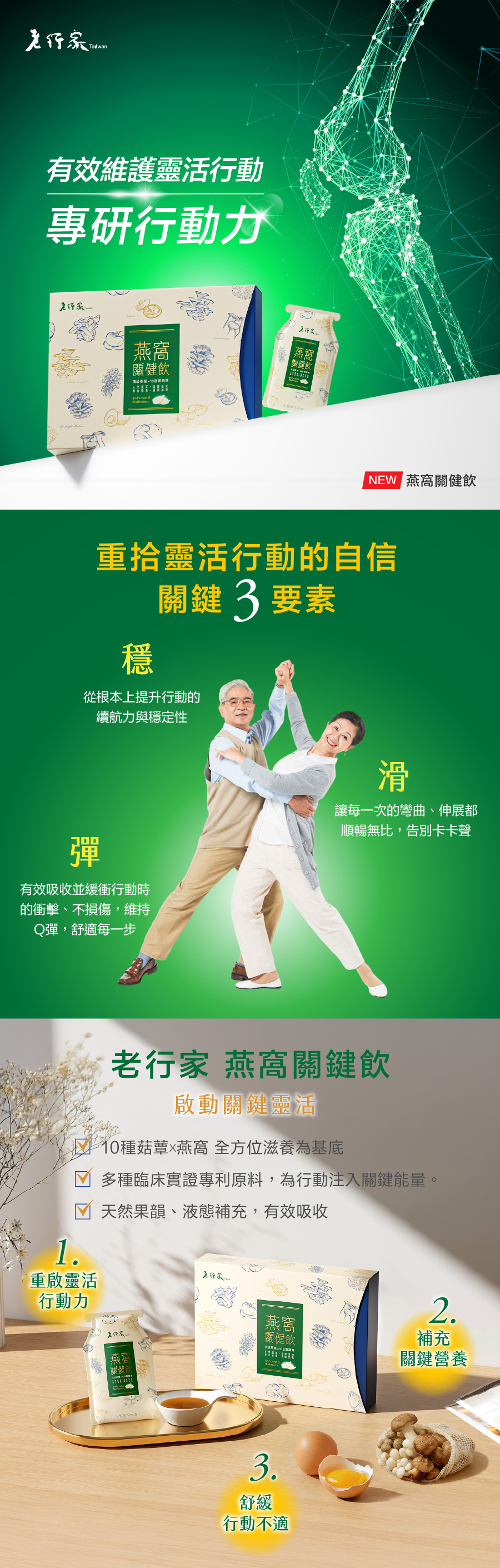 多重專利營養成分,從內而外幫助維持行動順暢與靈活,為行動力注入能量,守護每一步的輕盈自信。 -