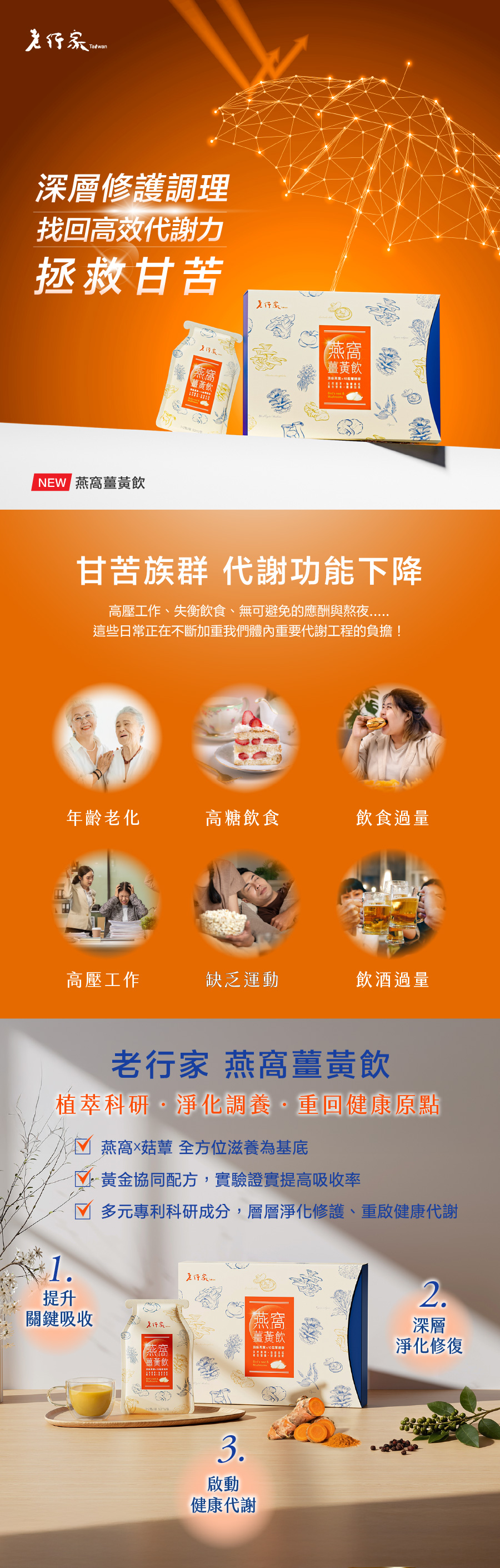 「老行家燕窩薑黃飲」以高溫高壓二次鮮萃10種菇蕈精華之「多醣體萃取液」,搭配含珍貴EGF與天然燕窩酸(唾液酸)的「燕窩水解物」為日常滋養基底。
