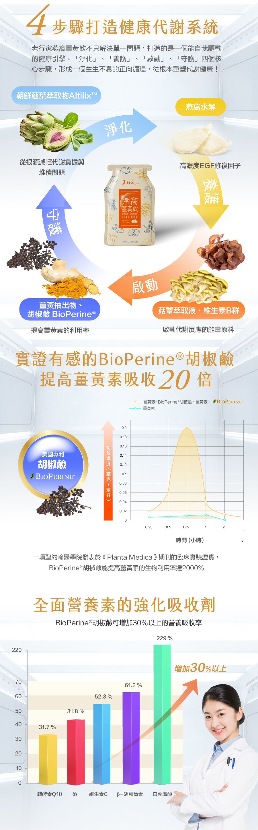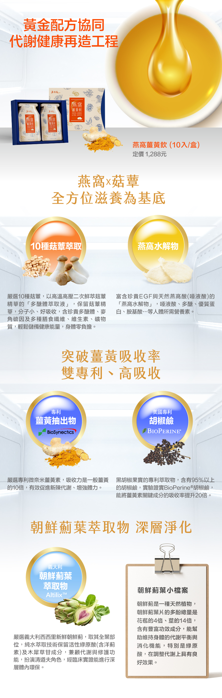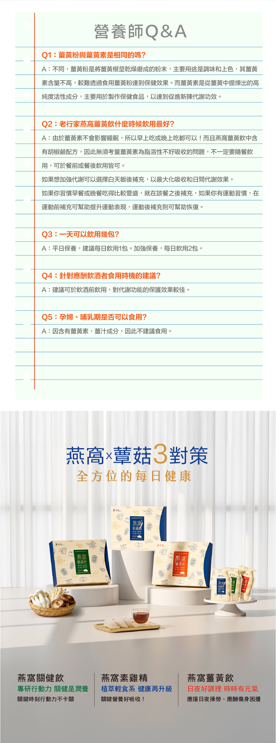 「老行家燕窩薑黃飲」以高溫高壓二次鮮萃10種菇蕈精華之「多醣體萃取液」,搭配含珍貴EGF與天然唾液酸的「燕窩水解物」為日常滋養基底。