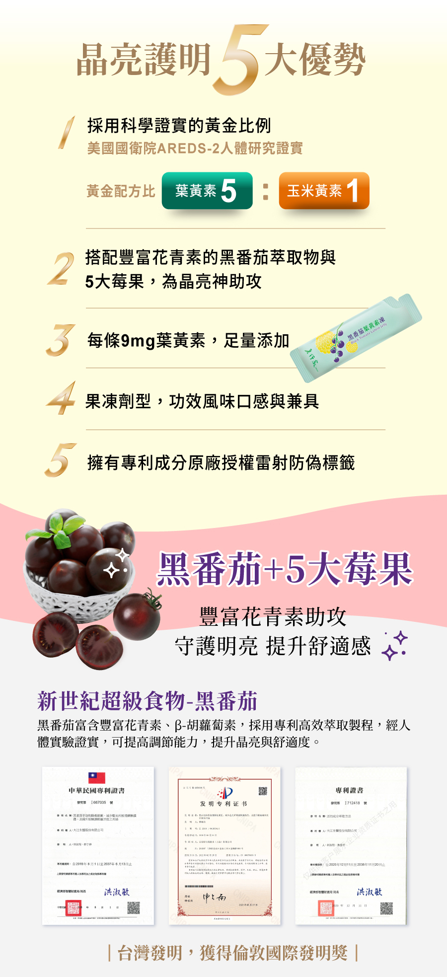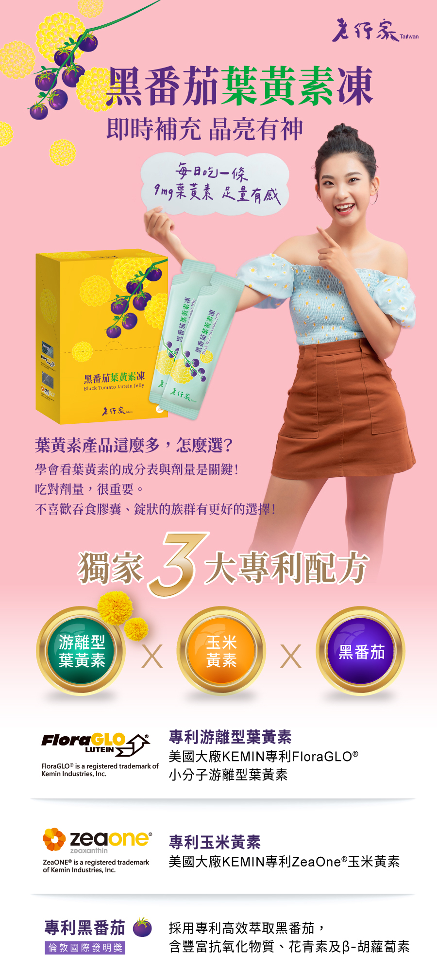 「老行家黑番茄葉黃素凍」獨家有感配方,嚴選美國大廠「FloraGLO®游離型葉黃素」,搭配專利非合成的「ZeaOne®金盞花萃取物(含玉米黃素) ,5比1科學研究黃金比例,結合「山桑子、智利酒果、野櫻莓、紫蘿蔔、黑醋栗」等多重莓果植萃,時時輕鬆補充,時時炯炯有神。