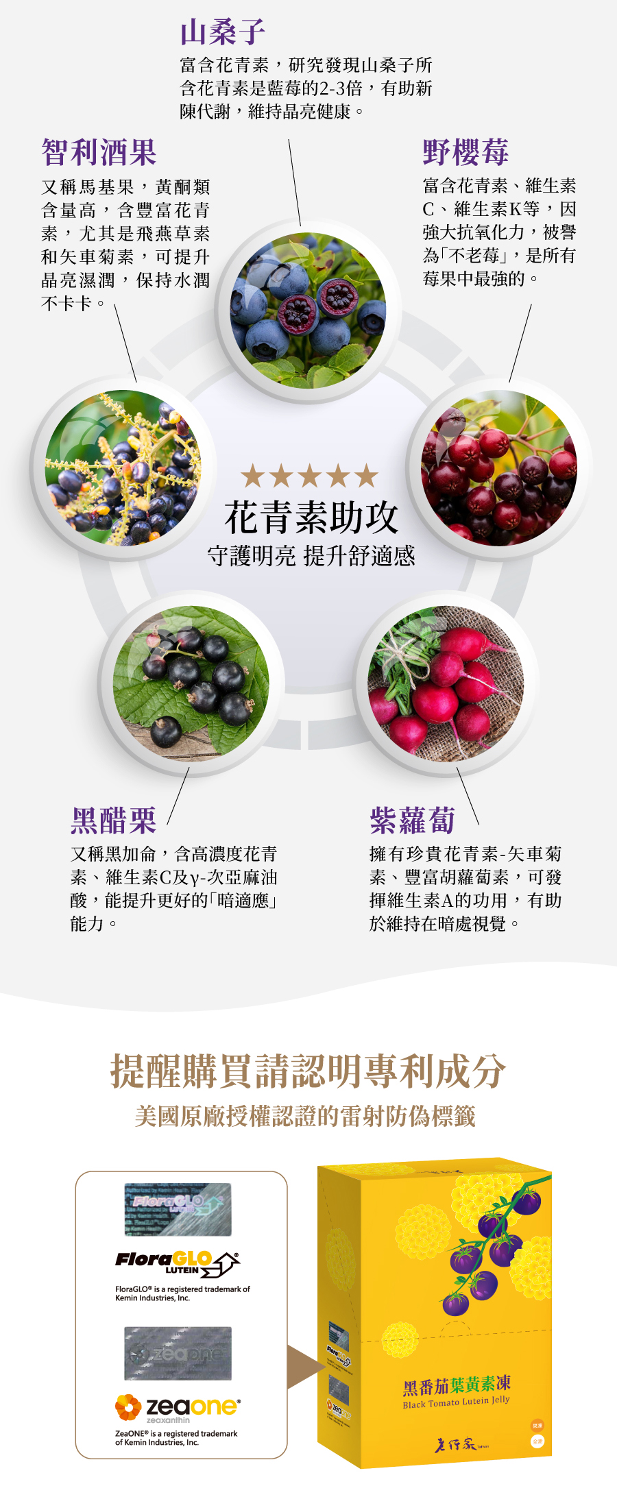 「老行家黑番茄葉黃素凍」獨家有感配方,嚴選美國大廠「FloraGLO®游離型葉黃素」,搭配專利非合成的「ZeaOne®金盞花萃取物(含玉米黃素) ,5比1科學研究黃金比例,結合「山桑子、智利酒果、野櫻莓、紫蘿蔔、黑醋栗」等多重莓果植萃,時時輕鬆補充,時時炯炯有神。 -